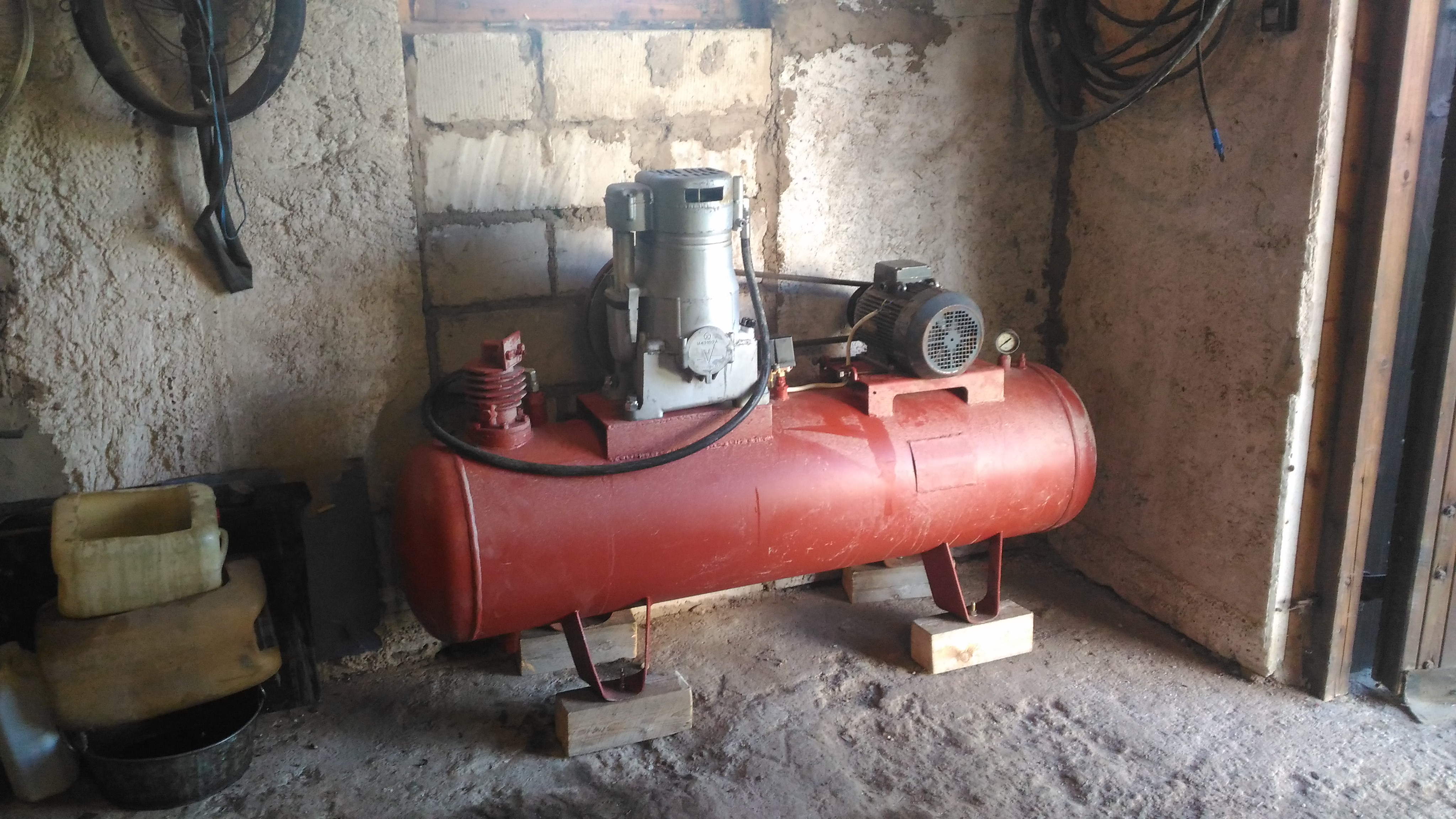 Nojh, kopa pealt pärit kompressor, õhu paagiks üks vene aegse korstna lüli, mis sai maja kõrvale püsti aetud. Töötab nagu peab, rõhukõikumine on pandud mingi poole ati peale. Kui õhku peaks lendama siis jama kui palju. Testida sai mingi 10 atiga, jäi kokku. :)